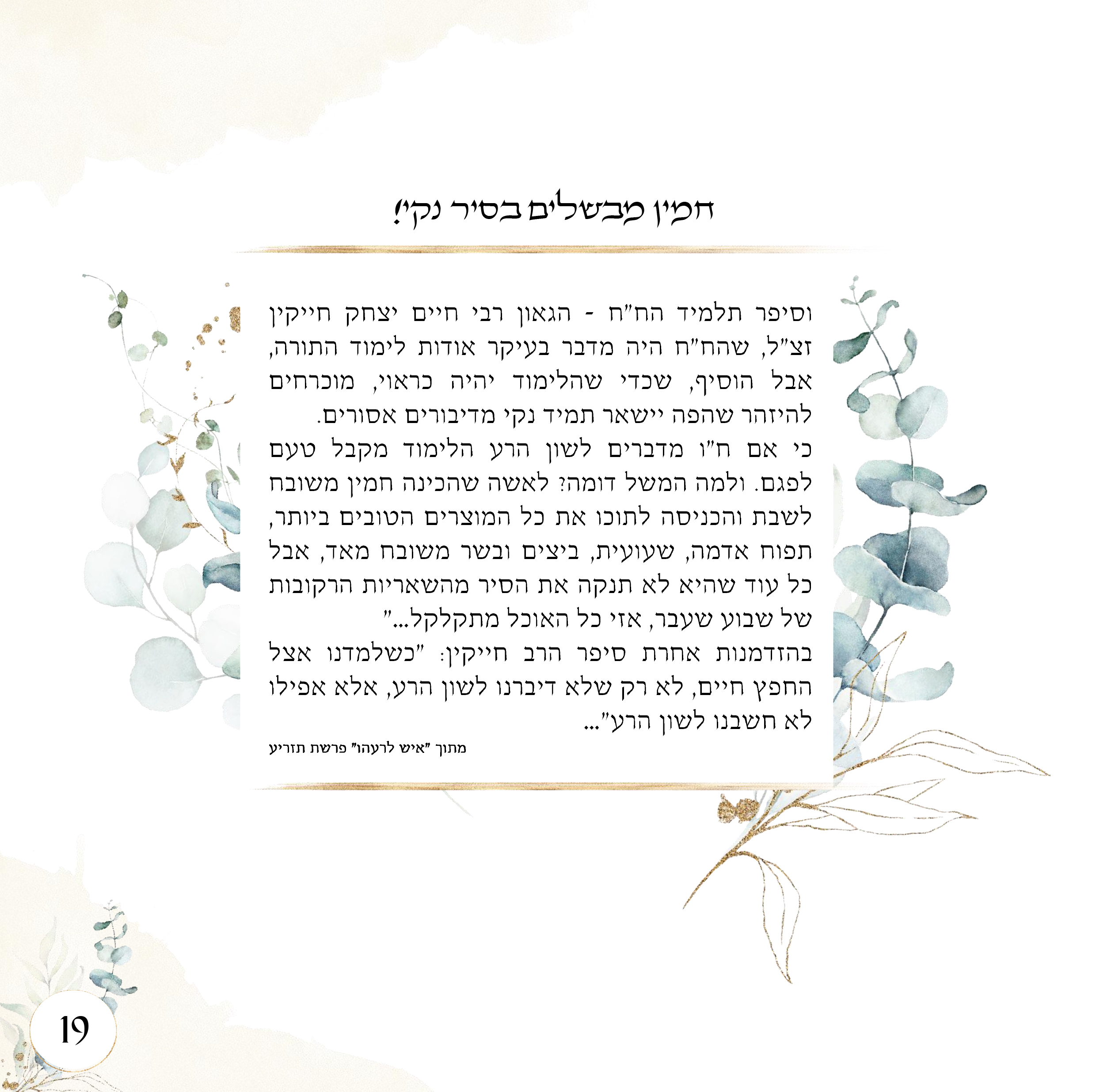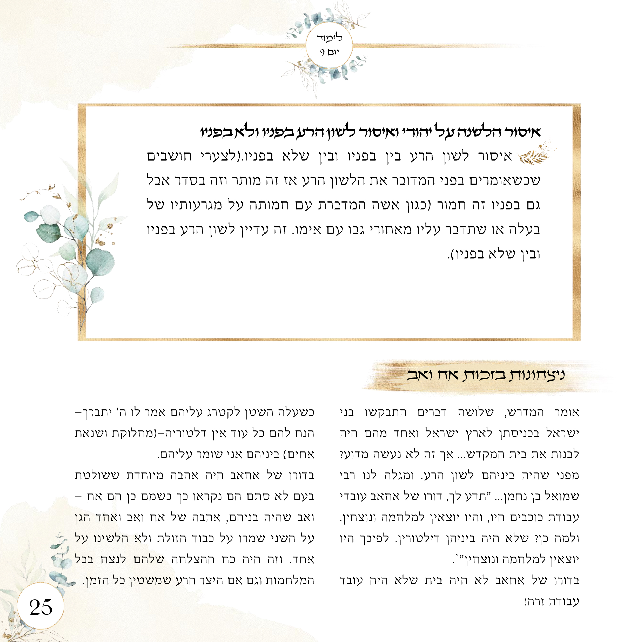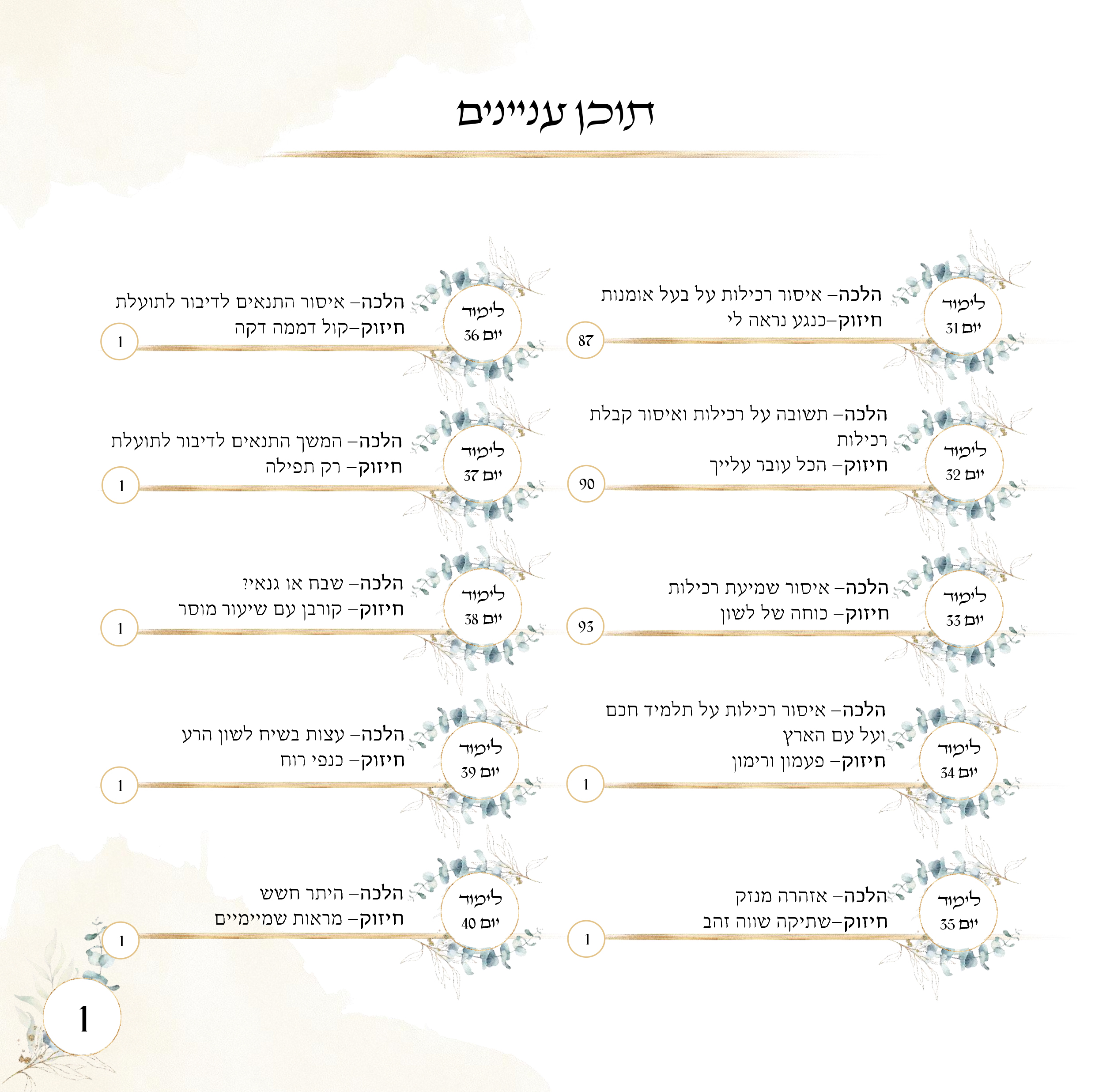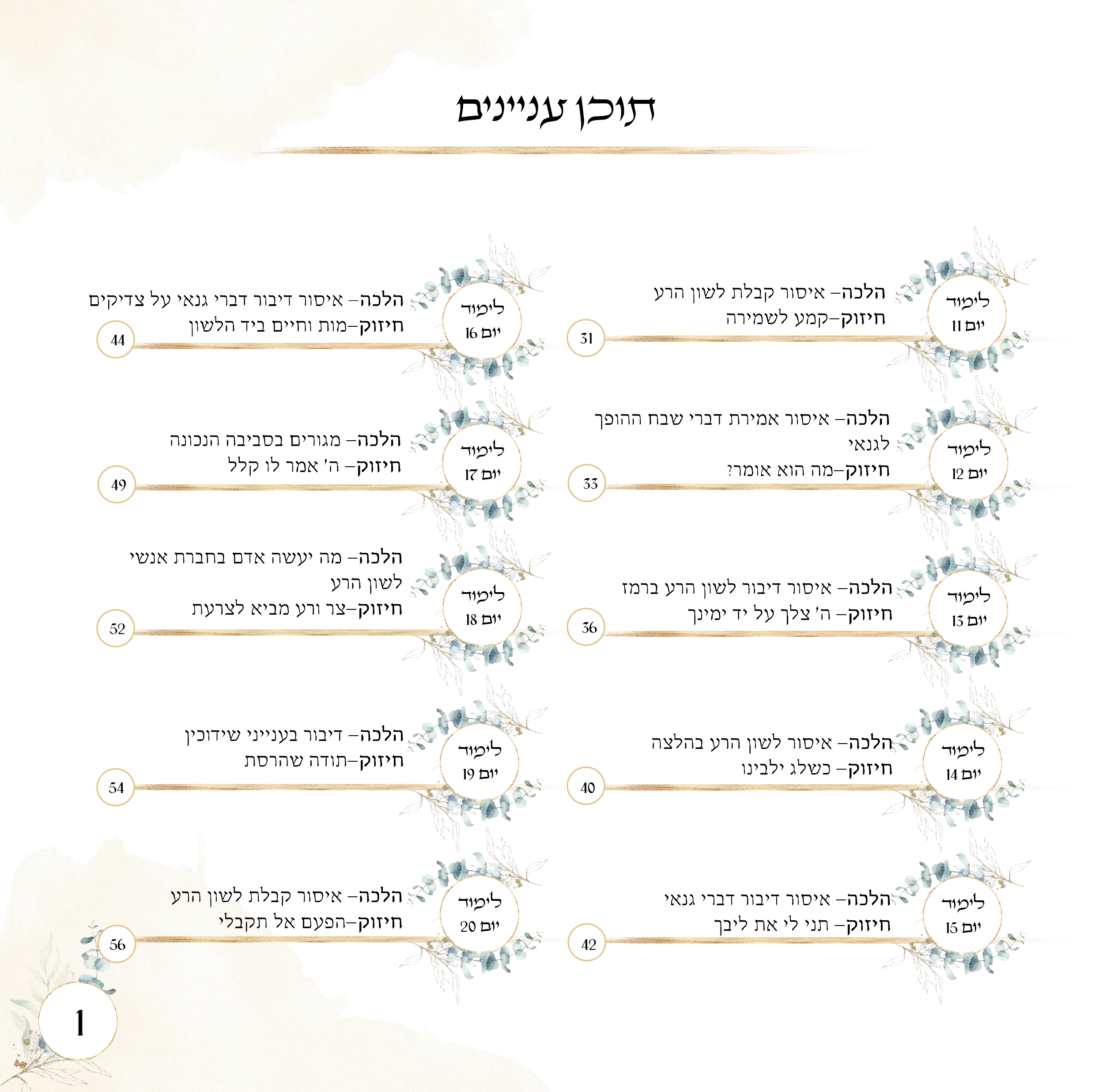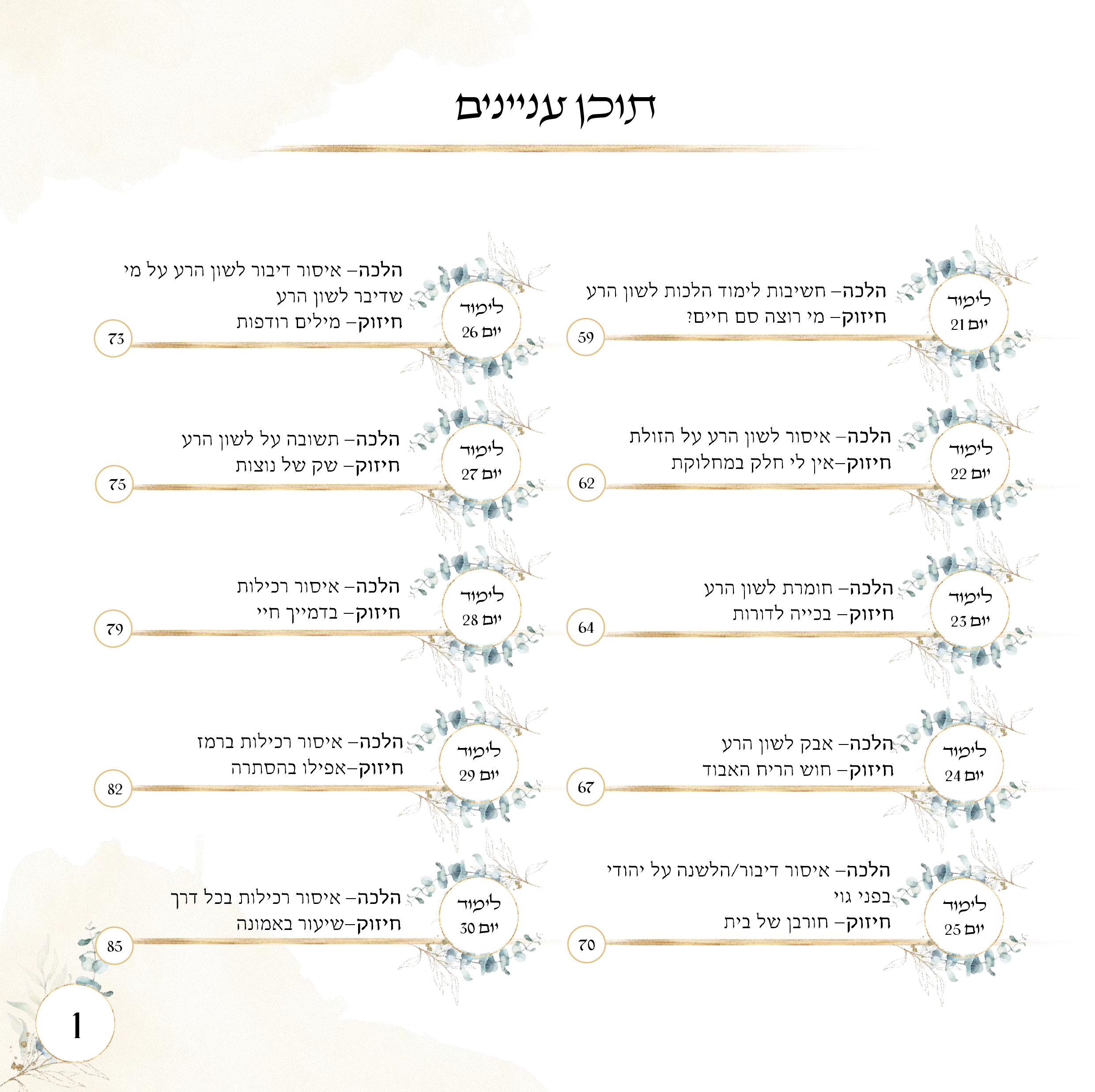 הספר מחולק ל40 יום של לימוד נפלא, כל יום 2 הלכות ובנוסף קטע מחזק ומרומם את הנפש המעודד ברגעי הניסיונות של שמירת הלשון.